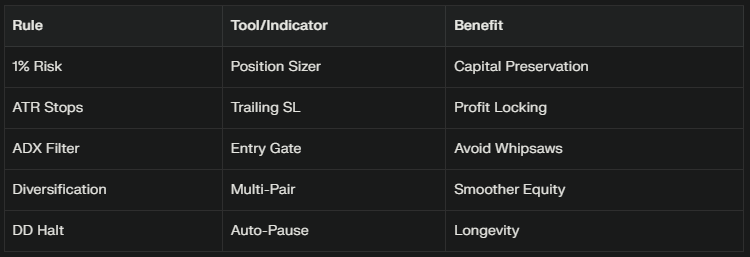 Rule 2: Automate ATR(14) stops—initial SL at 2x ATR, trail to 1x after breakeven. Adapts to GBP/JPY's 100-pip swings vs. fixed stops.