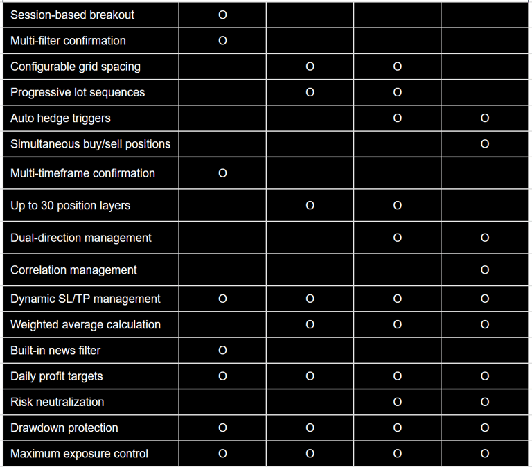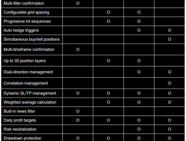 Progressive lot sizing: Increases position size algorithmically to optimize risk/reward.